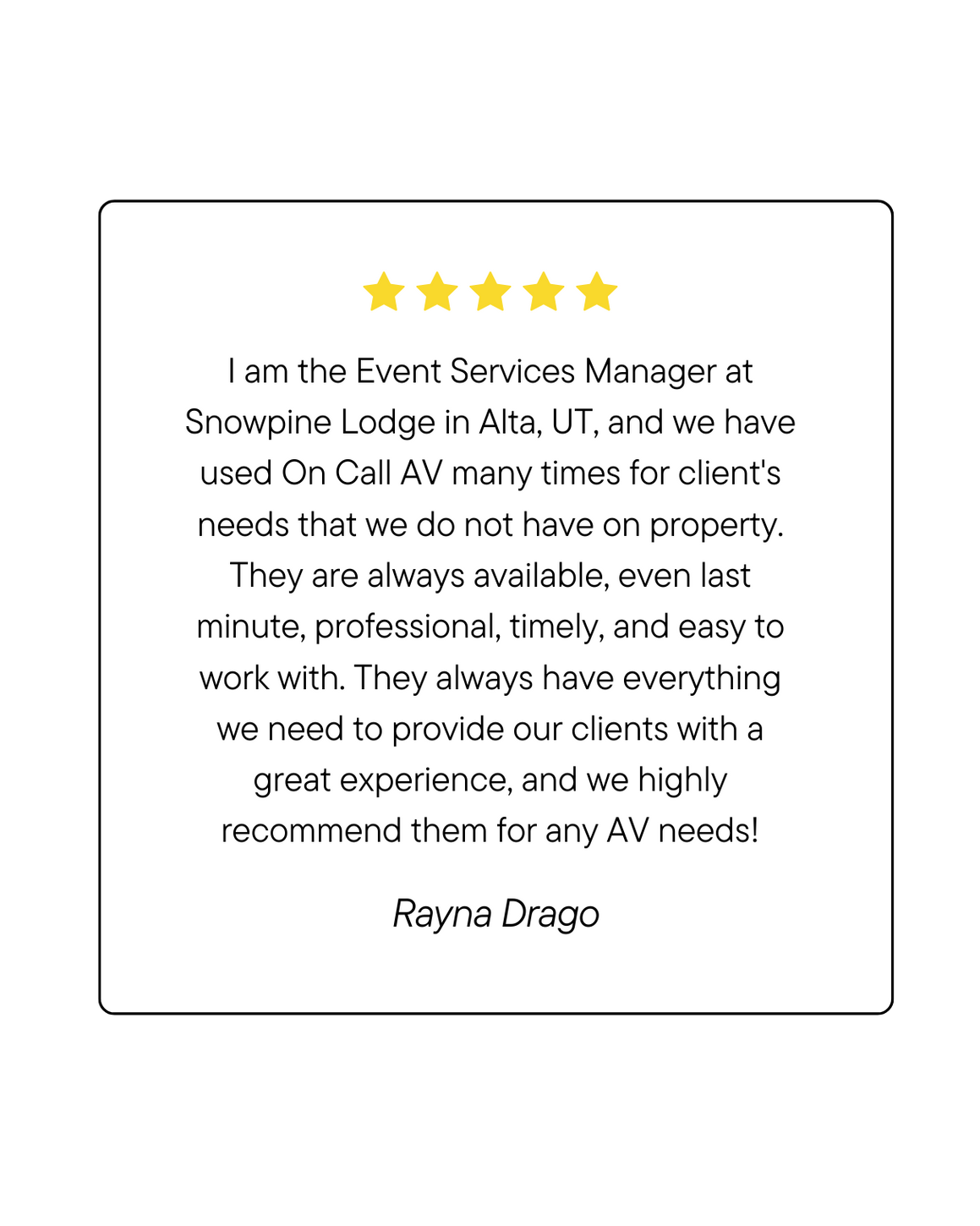 Since 2010, On Call AV has been your go-to solution for high-quality audio and video event production. We specialize in providing skilled AV technicians, comprehensive set-strike crews, and top-of-the-line audio, video, and lighting equipment tailored to different event types. Whether you’re in Utah or beyond, we’ve got the experience to ensure your event runs smoothly.